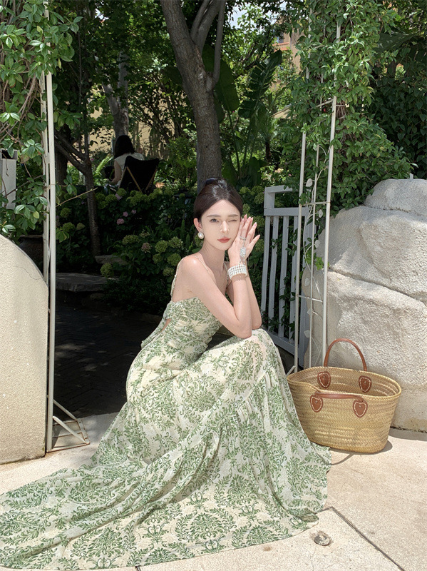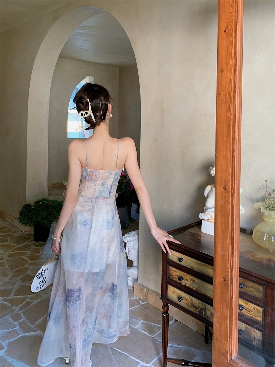 Đầm treo cổ in hình dây mùa xuân 2025 váy voan xẻ tà nữ mới màu trà hở lưng