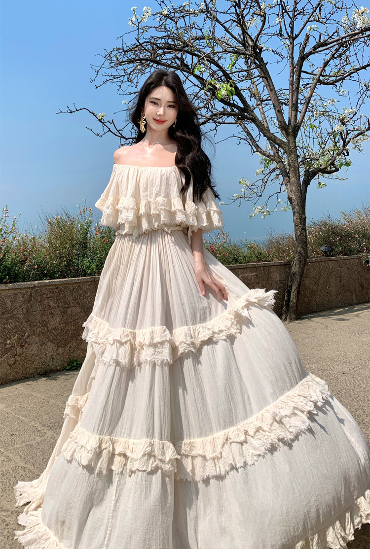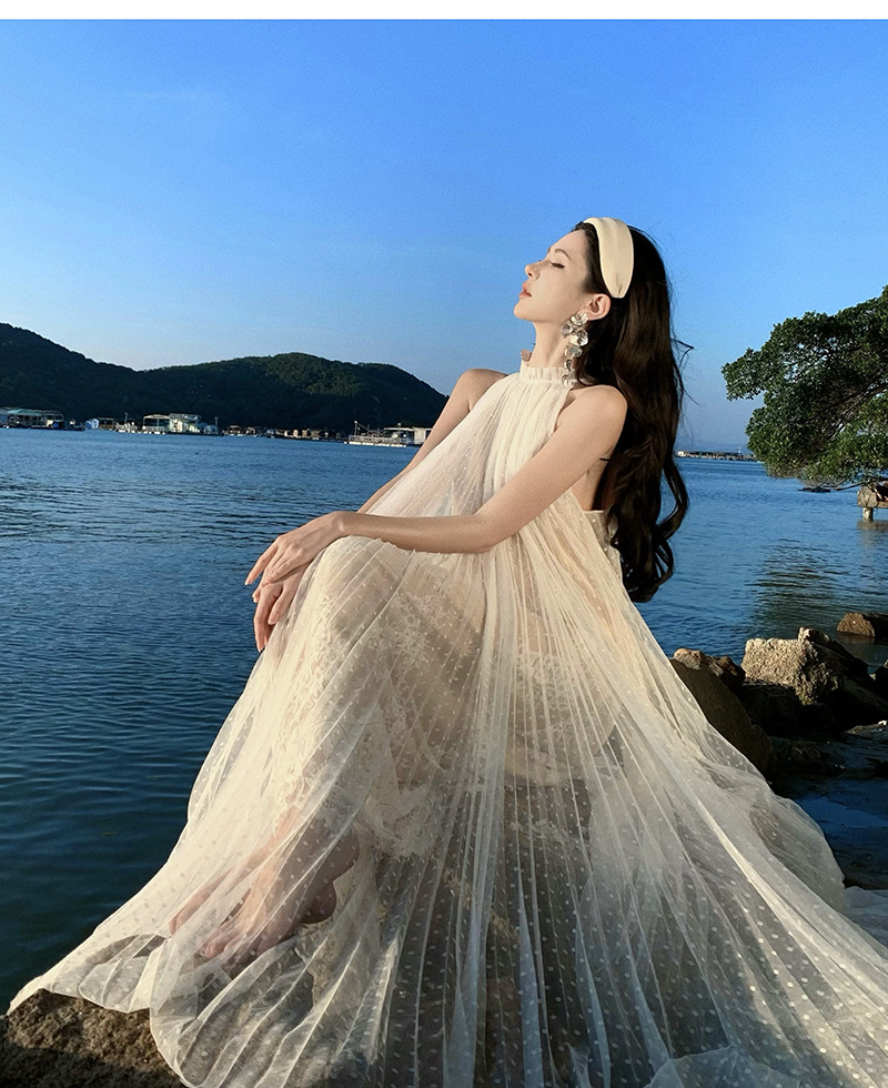 Mẫu mới 2025 ren kiểu Pháp dây treo cổ xếp ly dày đặc áo liền quần không tay váy siêu tiên nữ váy dài kỳ nghỉ